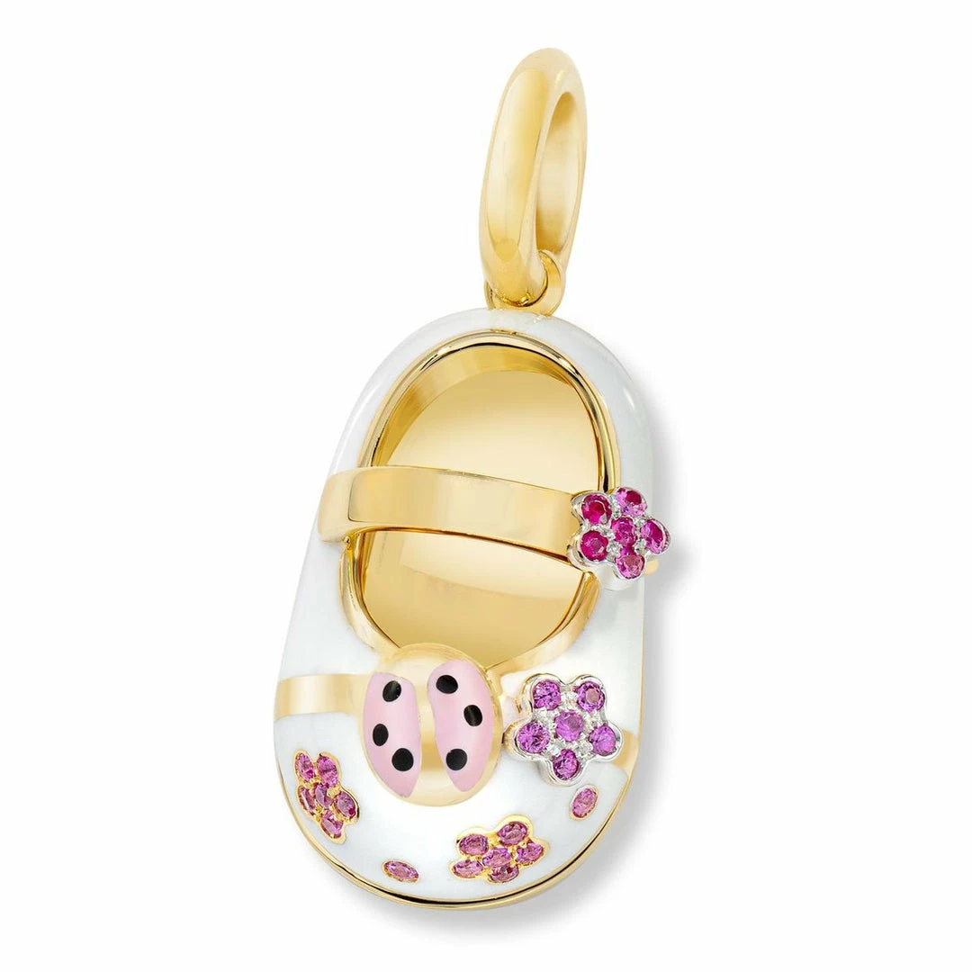 Celebrate the beautiful baby girl in your life with a signature Girl Baby Shoe Charm handcrafted by Aaron Basha, playfully decorated with ladybugs for protection and good fortune.