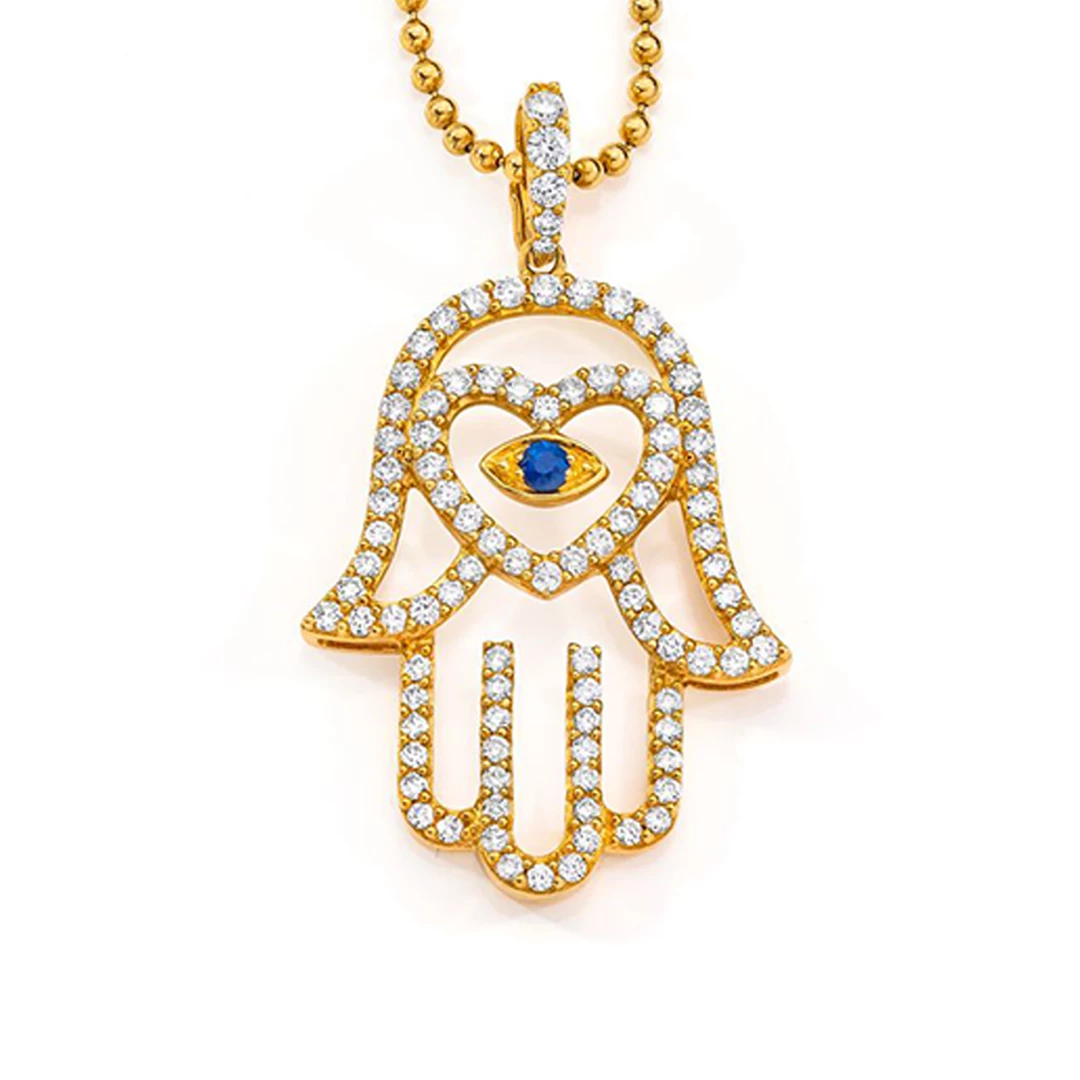 18K Yellow Gold Open Hand Hamsa Charm with Diamonds & Sapphire with Ball Chain