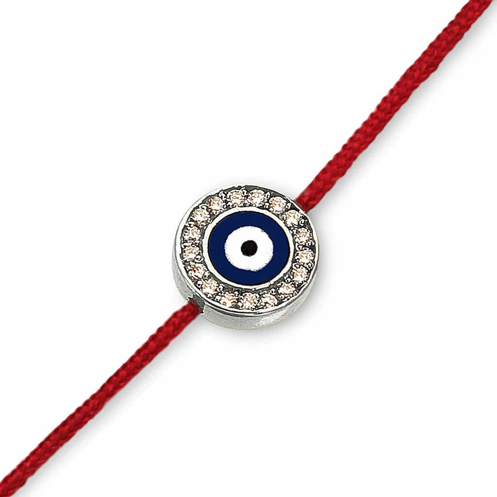 18K Gold Small, Evil Eye Red Cord Bracelet, Navy Enamel with Diamond Rim 0.12 cts.
