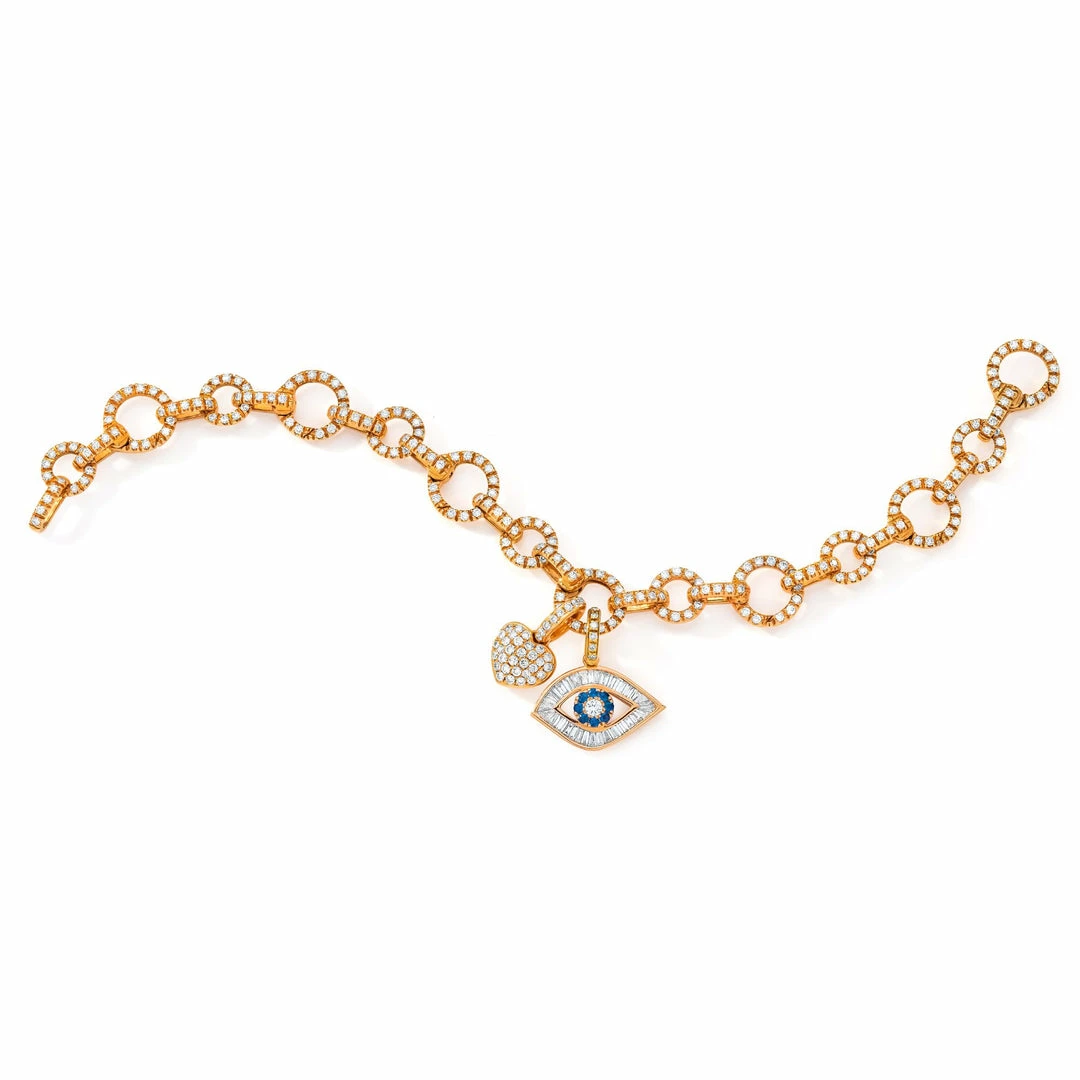 | Title | 18K Rose Gold Small Round Full Pave Bracelet, 18K Rose Gold Medium Pave Heart Charm, 18K Rose Gold Large Baguette Evil Eye Charm with Sapphires |