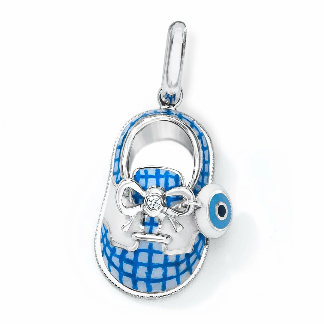 It’s easy to fall in love with this fun and amusing blue gingham baby saddle shoe charm by Aaron Basha. A beautiful dark blue enamel is interwoven with light blue for the perfect design contrast. Topped off with a white enamel saddle on an 18kt white gold shoe with .01 carat diamond bow accent, this fabulous Aaron Basha charm is sure to set tongues wagging about your wonderful taste in fashion!