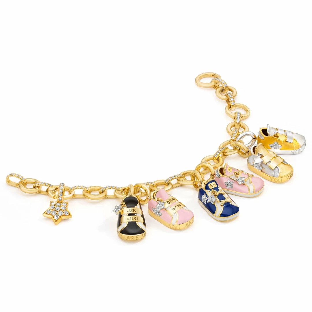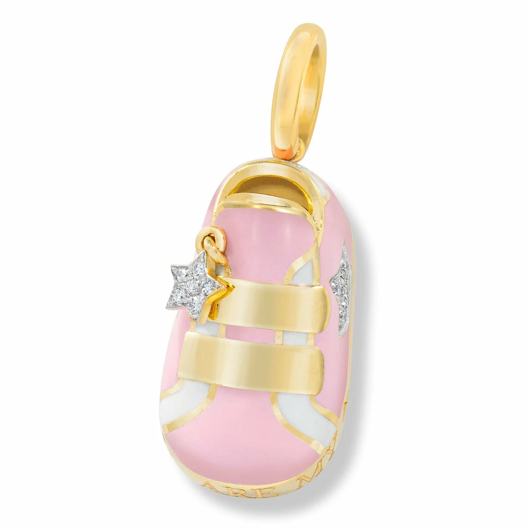 18K YG, pink with white stripe double strap sneaker with hanging star & star on body; .10ct.
