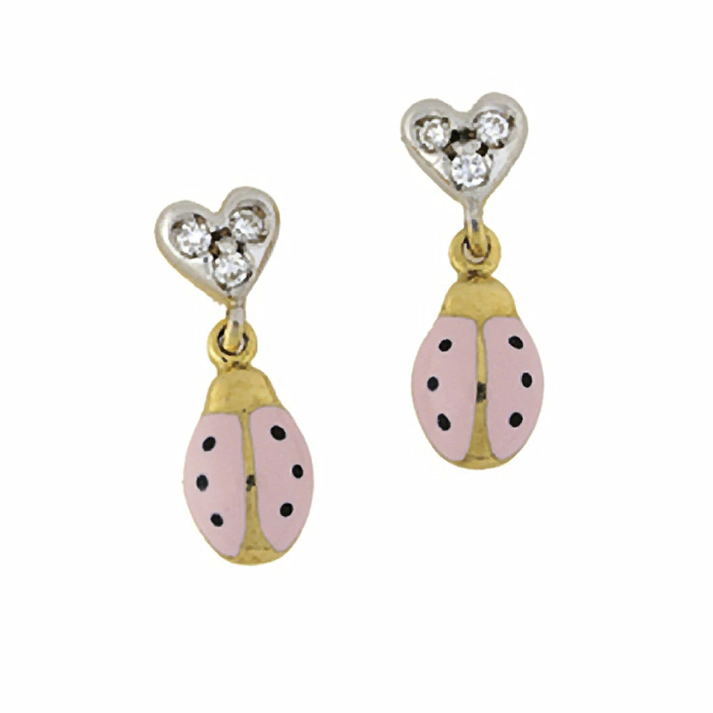 18K Yellow Gold Small Pink Ladybug Earring with Diamond Heart .08 Carat
