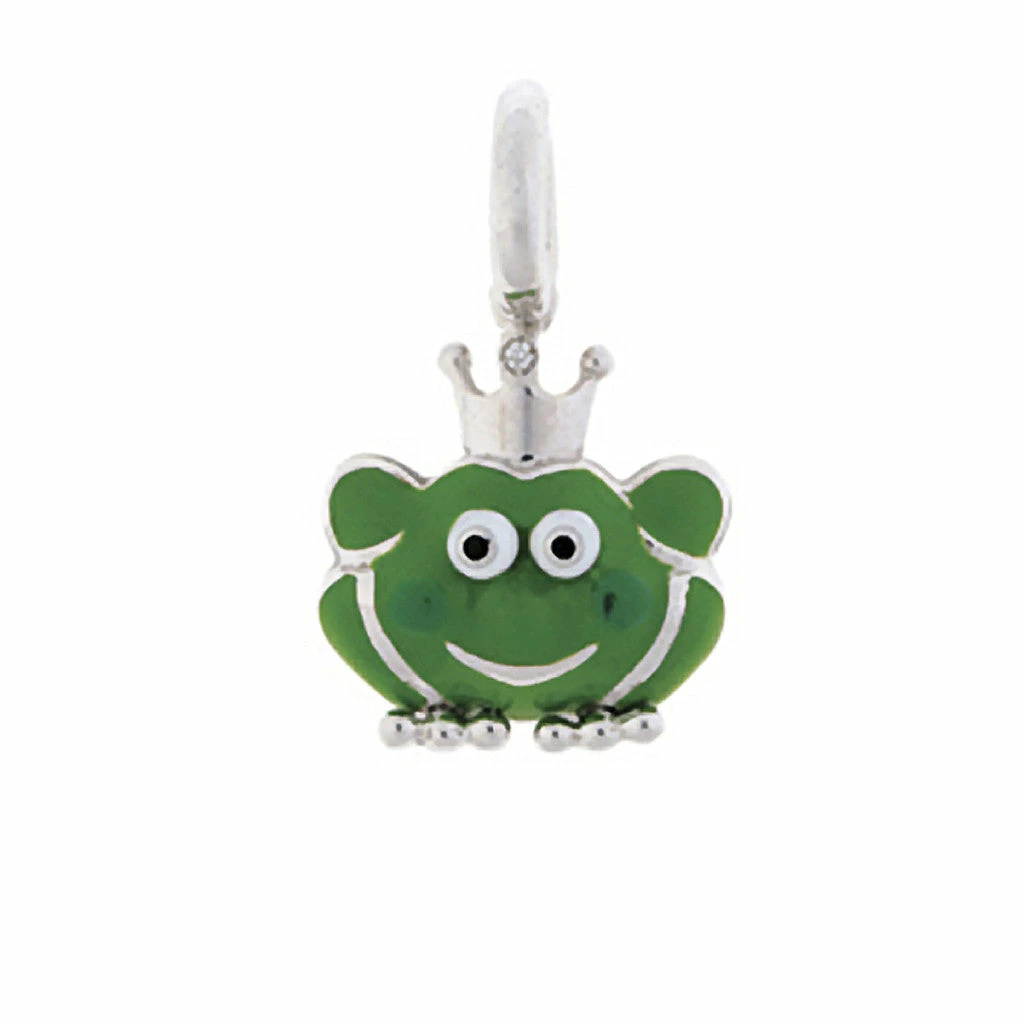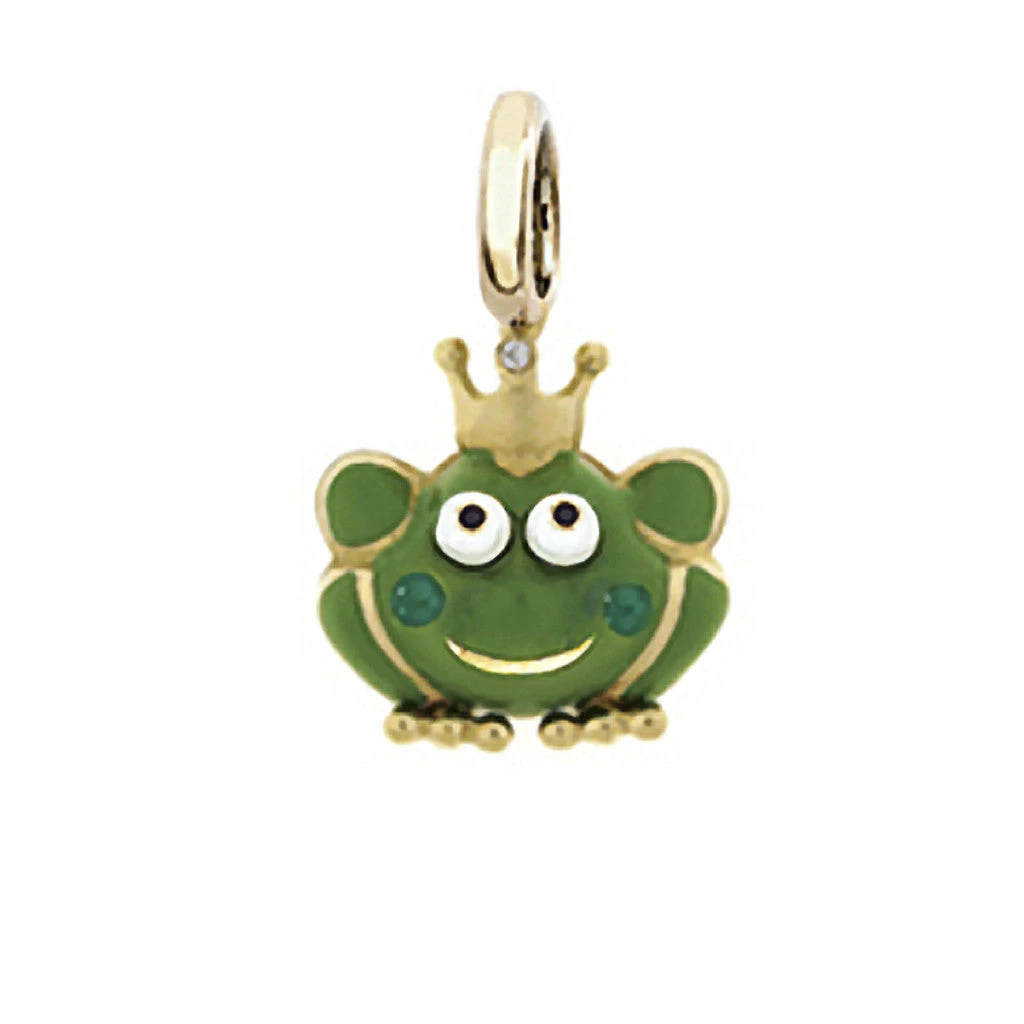 18K Small Frog Prince Charm Green Enamel with crown; .04 Ct