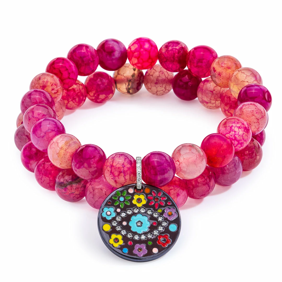 This set consists of fuchsia agate beads with ceramic eye charm with painted flowers & an additional matching bracelet to pair with your charm bracelet.