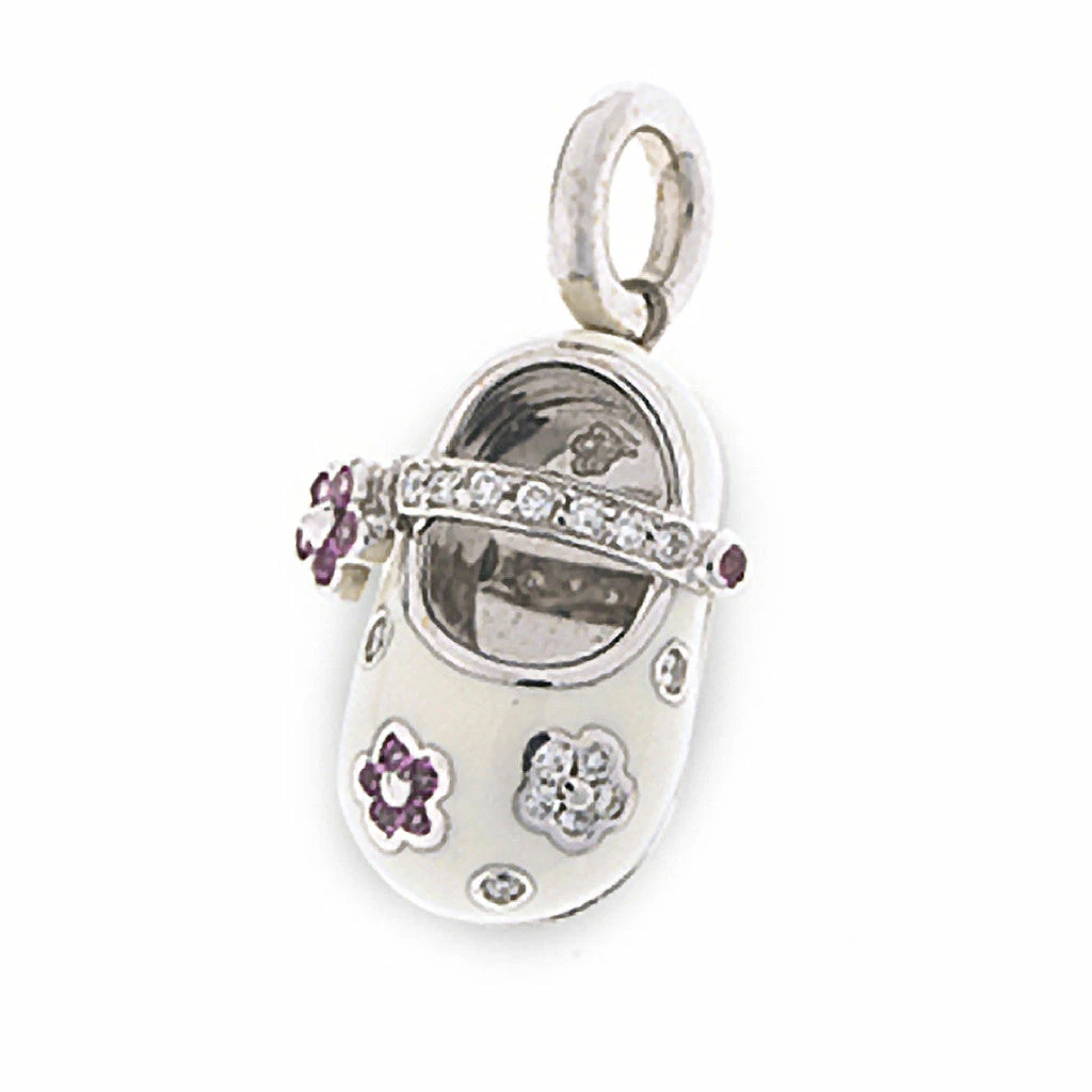 Celebrate the beautiful baby girl in your life with a simply elegant, signature Girl Baby Shoe Charm handcrafted by Aaron Basha, delicately decorated with pink sapphire floral designs. This charm is accented with a vibrant dangling floral sapphire for an added feminine touch.