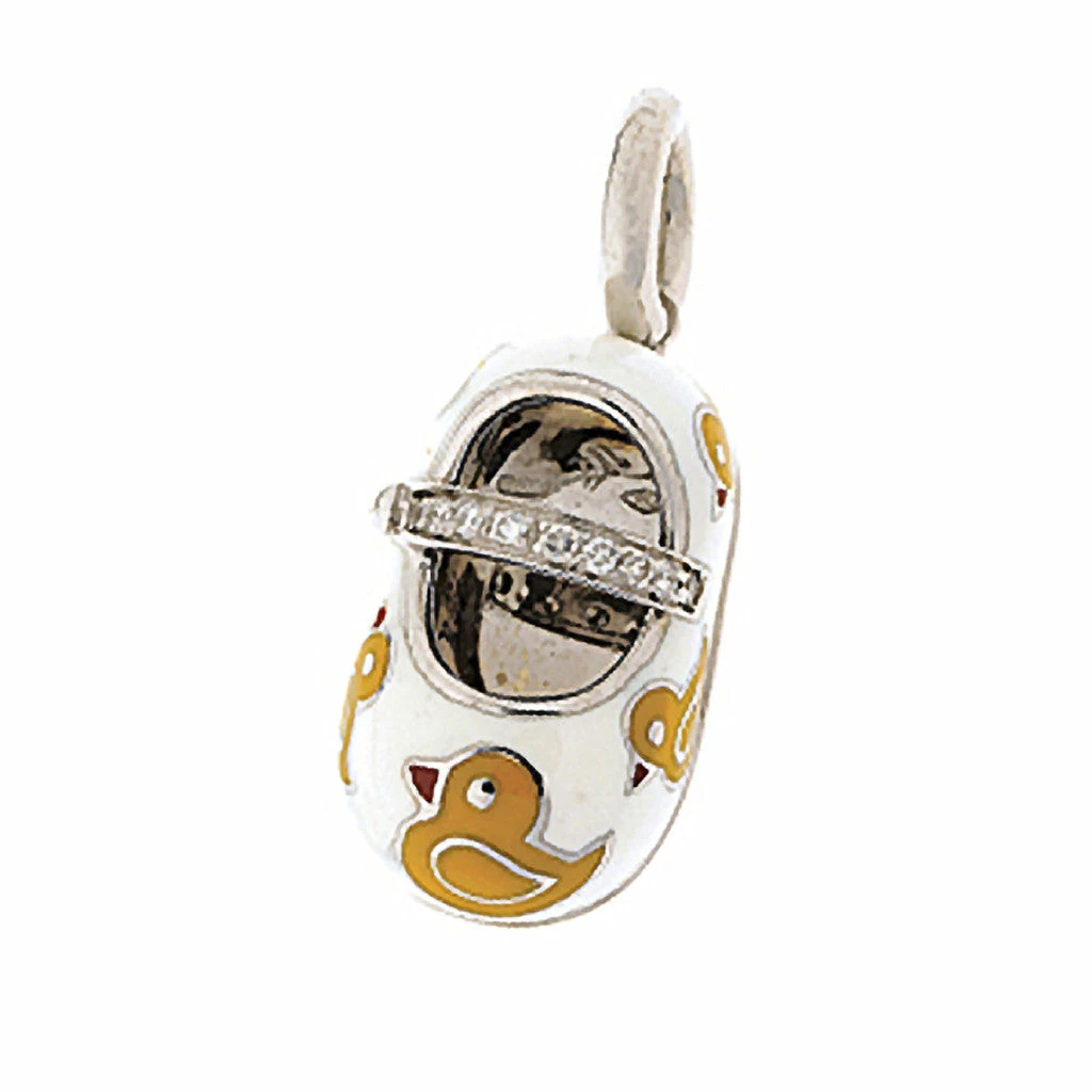 Celebrate the beautiful baby girl in your life with an elegant signature Girl Baby Shoe Charm handcrafted by Aaron Basha. Playfully decorated with stylized rubber ducks in a sunny yellow enamel for added nostalgia to any piece of jewelry.