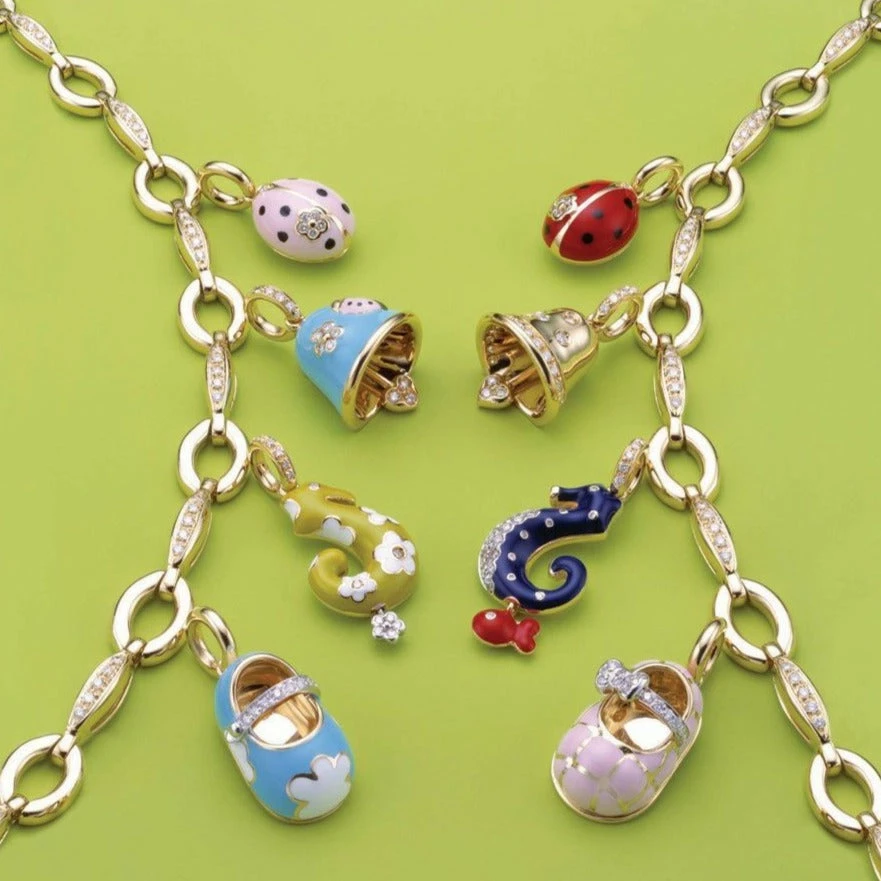 | Style | 18K Yellow Gold Green/White Flower Seahorse Charm with diamond flower; .10ct., 18K Yellow Gold Navy with hanging fish Seahorse Charm; .21ct |