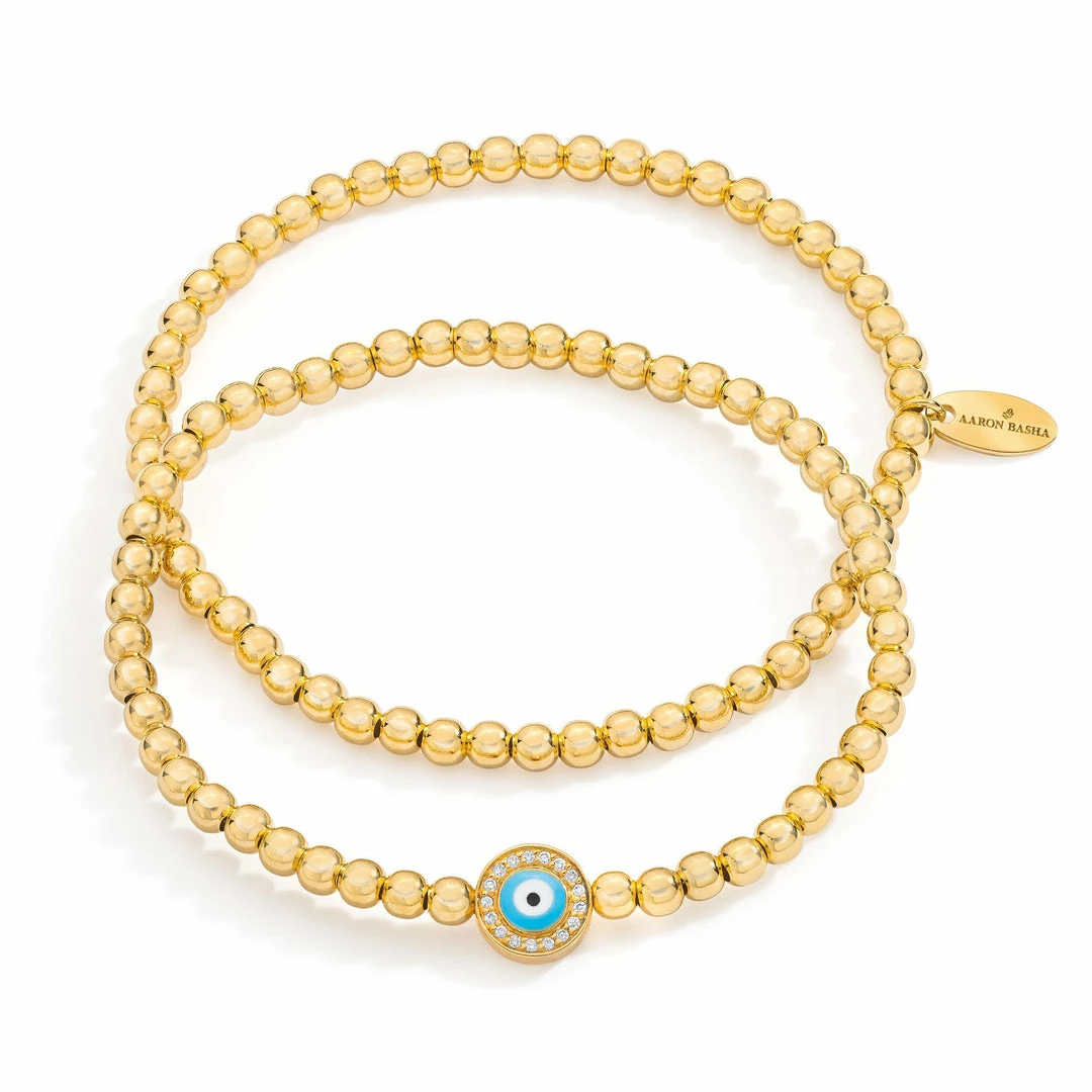 Aaron Basha 18K Yellow Gold Light Blue Evil Eye With Diamond Rim On Single Strand Bracelet